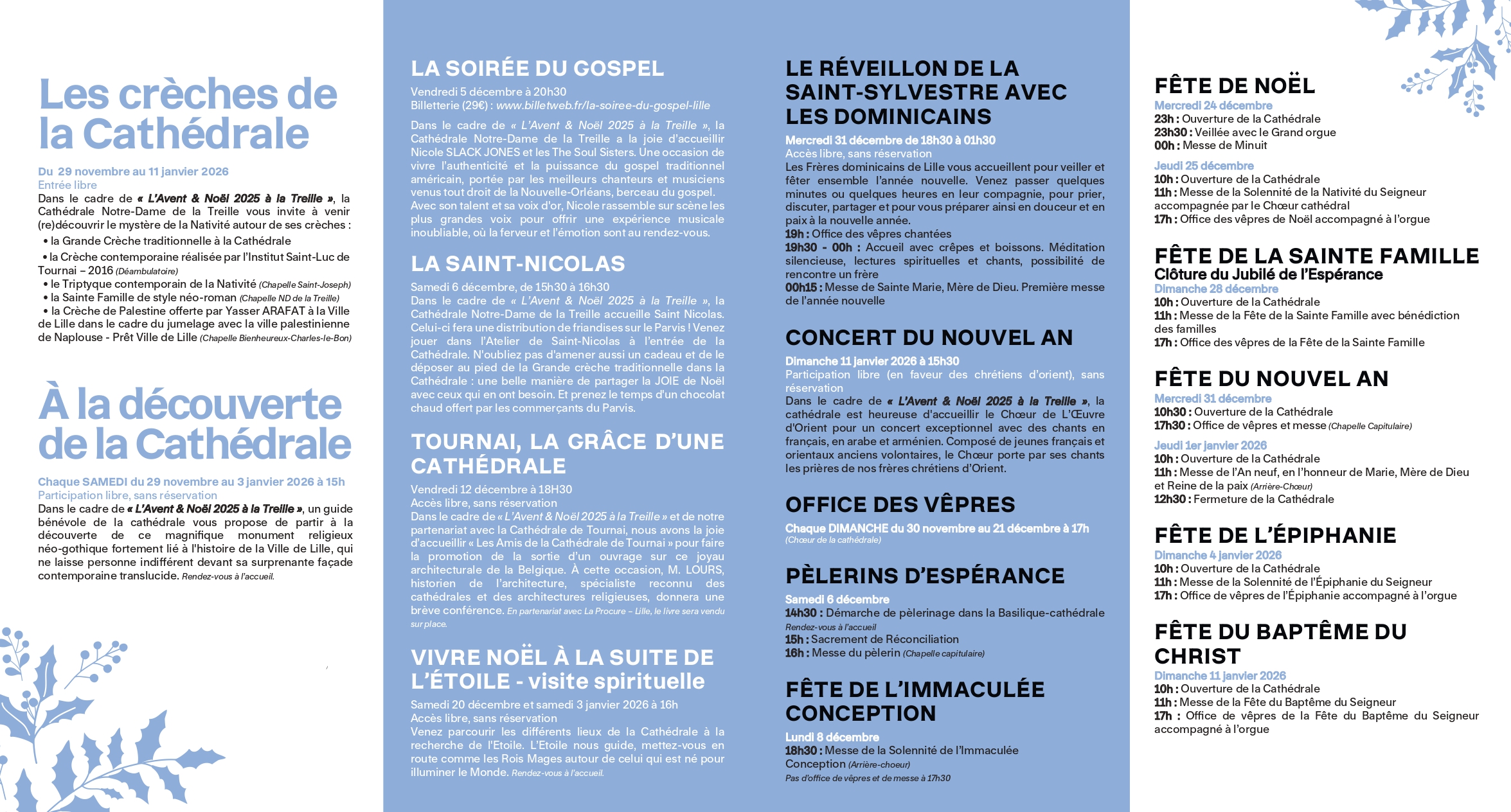 Dans le cadre de « L’Avent & Noël 2025 à la Treille » et de notre partenariat avec la Cathédrale Notre-Dame de Tournai, la Cathédrale Notre-Dame de la Treille a la joie d’accueillir l’association des « Amis de la Cathédrale de Tournai » pour faire la promotion de la sortie d’un ouvrage sur ce joyau architecturale de la Belgique À cette occasion, Monsieur Mathieu LOURS, historien de l’architecture, spécialiste reconnu des cathédrales et des architectures religieuses, donnera une brève conférence. En partenariat avec La Procure – Lille le livre sera vendu sur place.